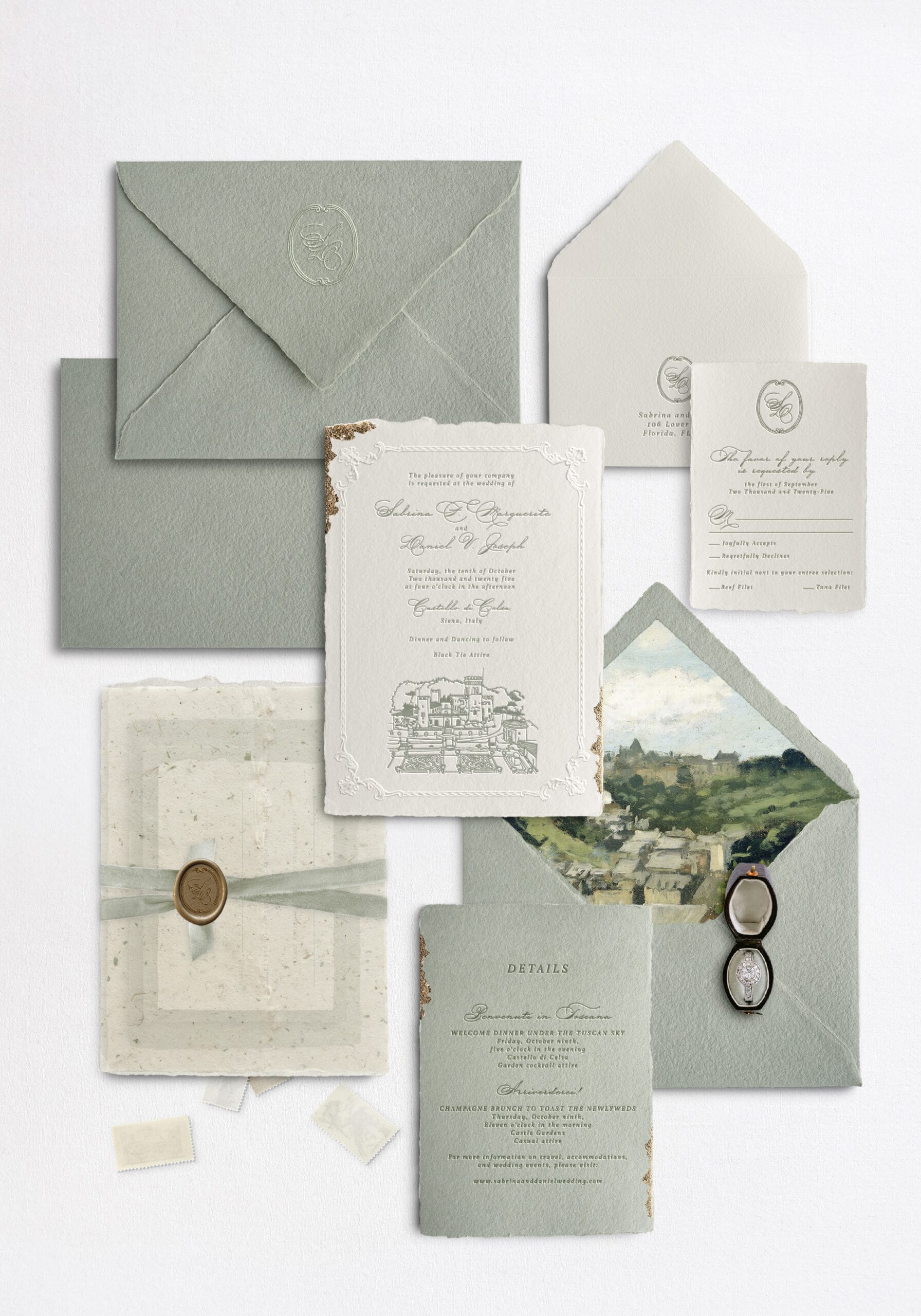 Printed on handmade paper with blind embossing and letterpress, the design is finished with a custom monogram wax seal, hand-dyed silk ribbon, and subtle gold leaf edging. A soft palette of sage and ivory keeps the look refined, while an optional custom venue illustration — as shown in the second digital mock-up — adds a personal touch.