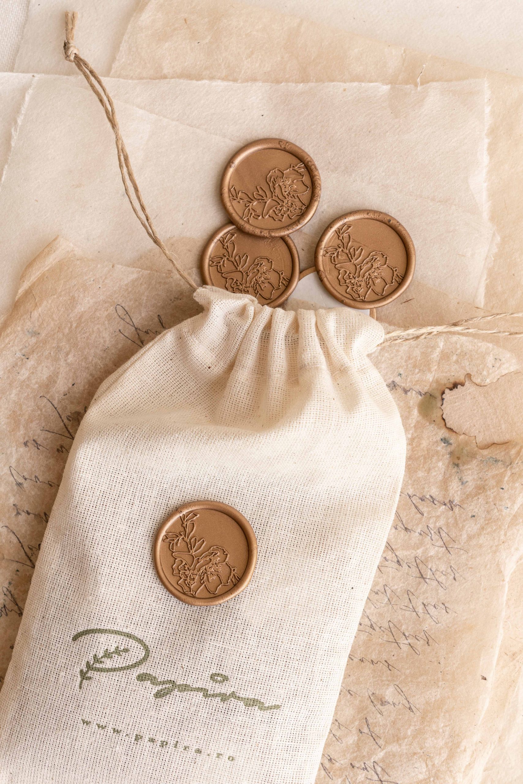 All our self-adhesive wax seals are made entirely by hand, each one completely authentic and unique. Hand stamped in our studio using real sealing wax, which will not break or crack in the mail.  They come packaged in our custom linen branded pouch.