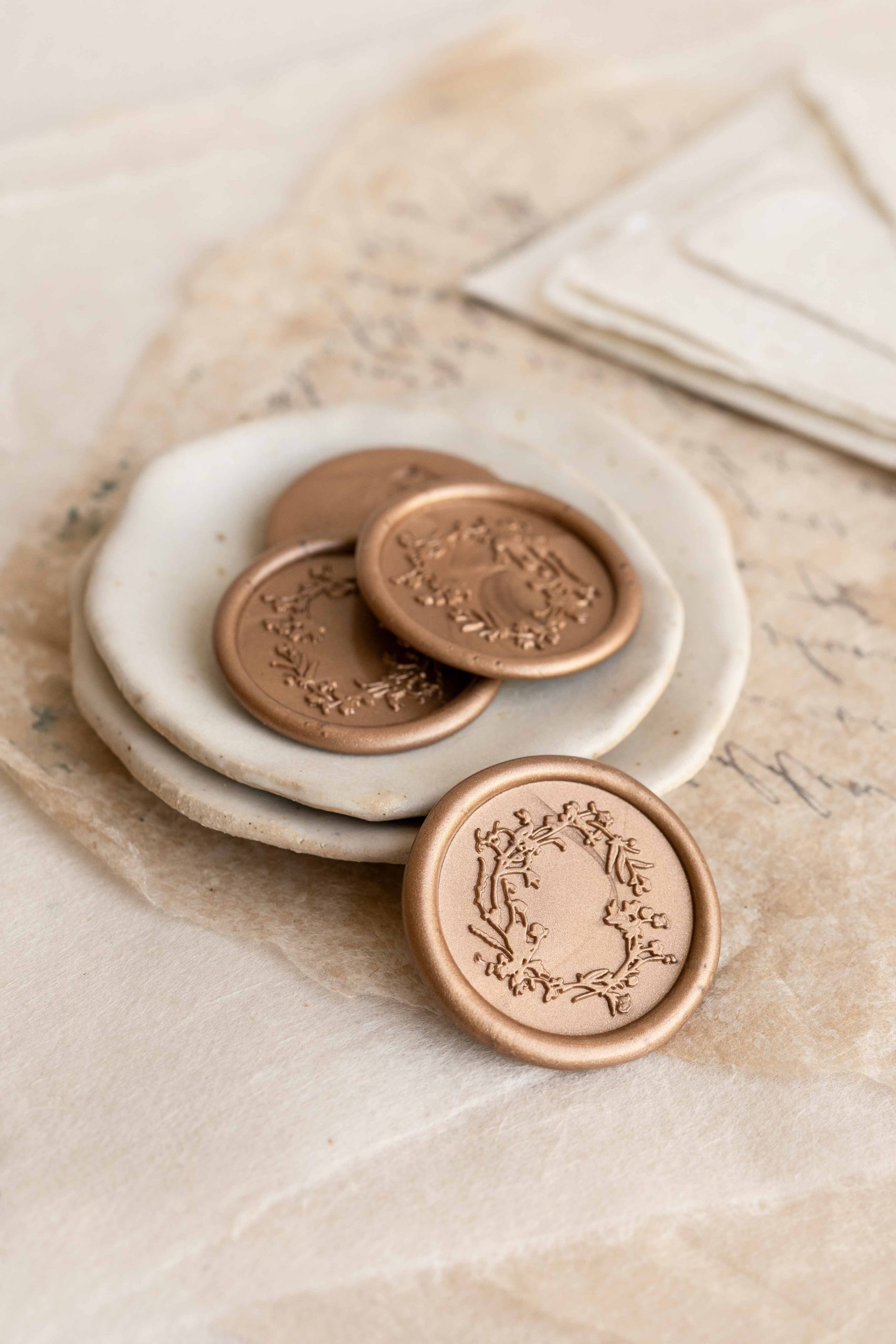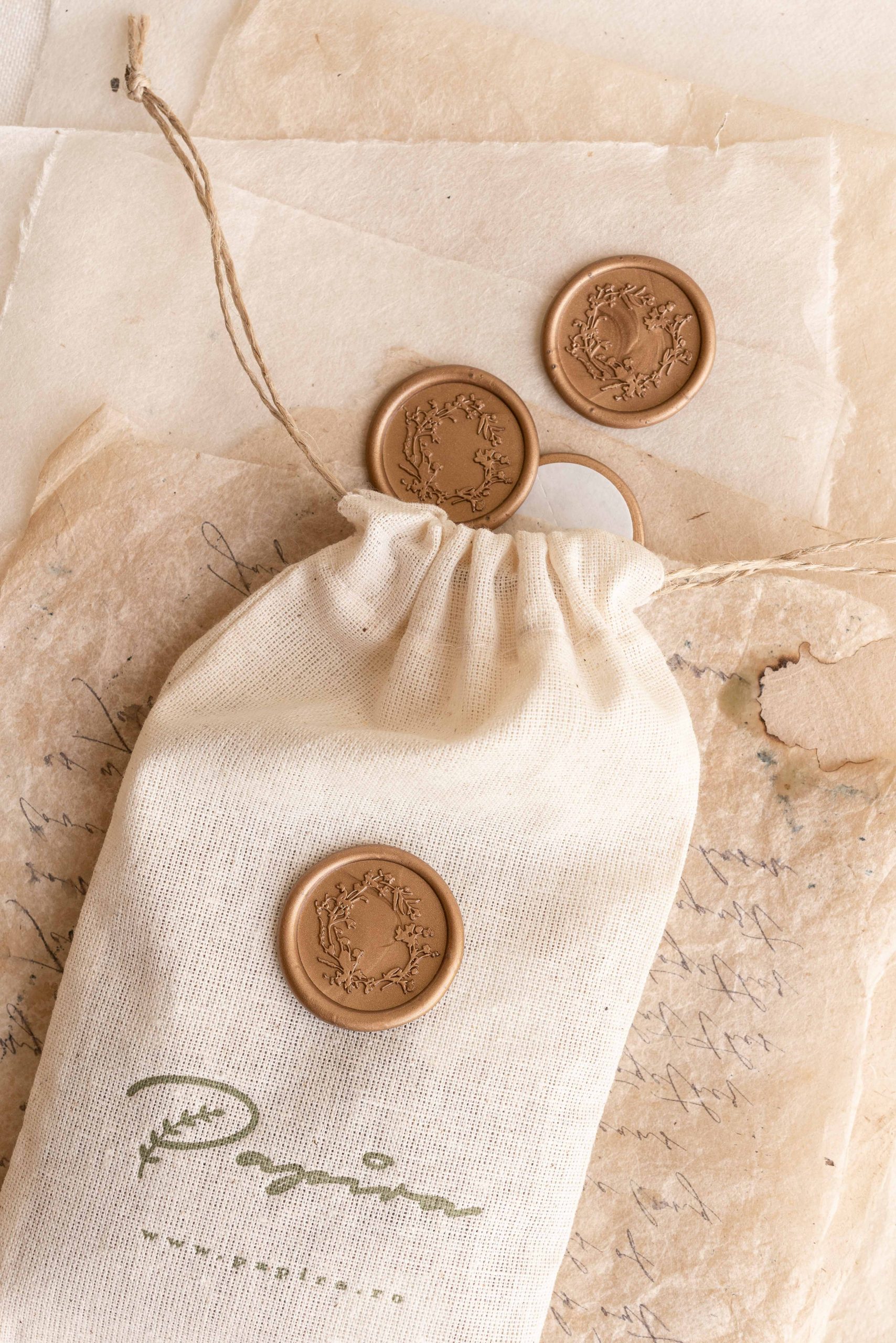 All our self-adhesive wax seals are made entirely by hand, each one completely authentic and unique. Hand stamped in our studio using real sealing wax, which will not break or crack in the mail.  They come packaged in our custom linen branded pouch.