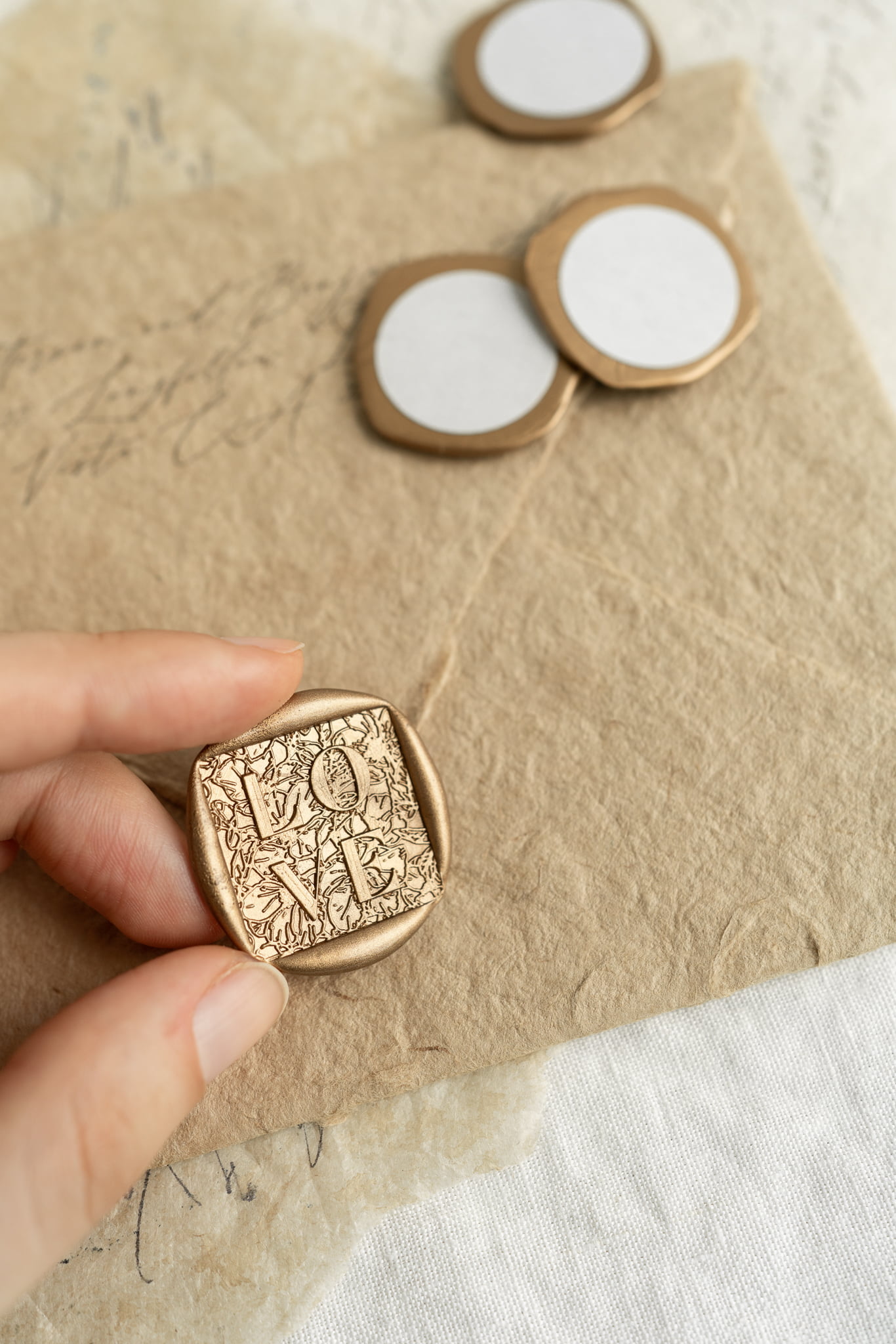 Self-adhesive seals are the easiest and most elegant way to personalize your wedding invitations and set the mood for your special day. The wax seals can be used to seal not only your invitations, but also letters, gifts, and holiday presents. You can use them for envelopes or any other stationery element. All you have to do is peel off the self-adhesive tape and press them on the desired item.