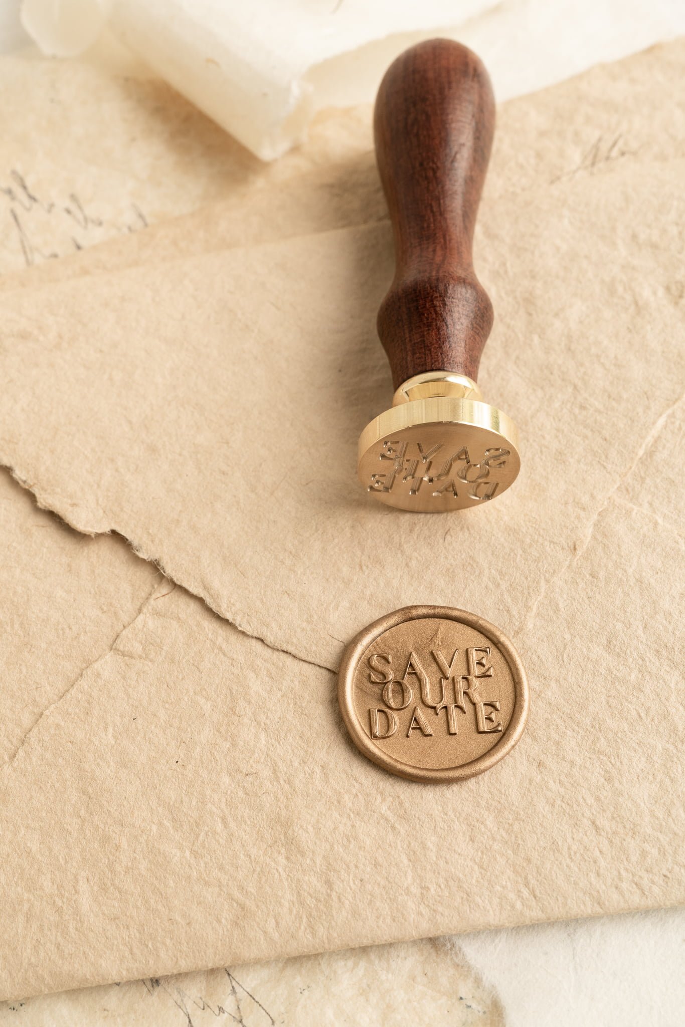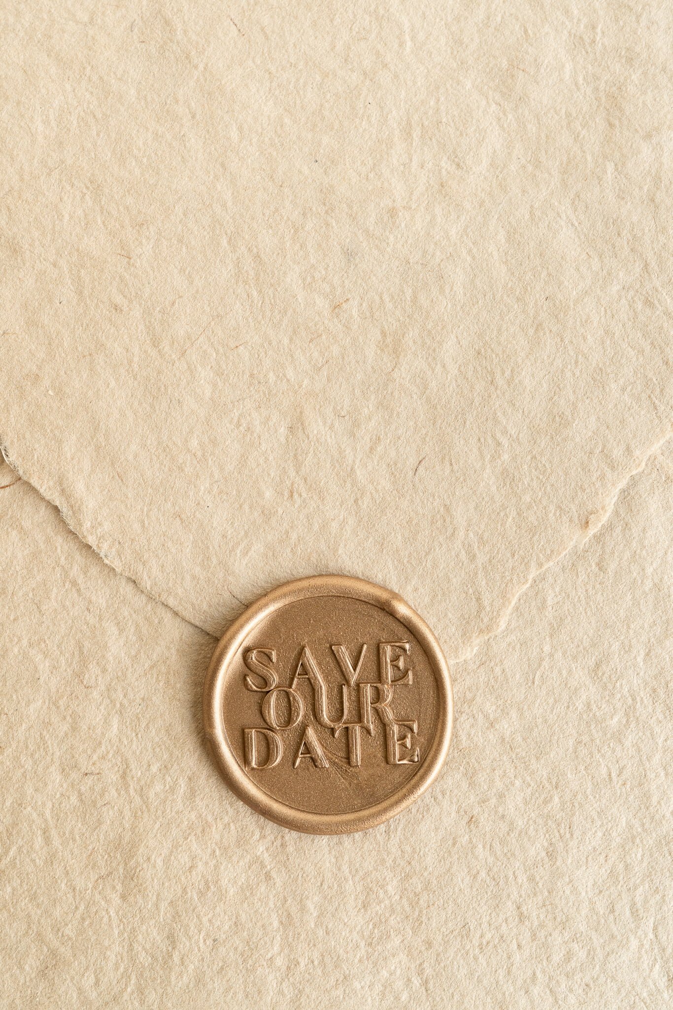 Ștampilă de ceară tradițională cu designul “SAVE OUR DATE”.