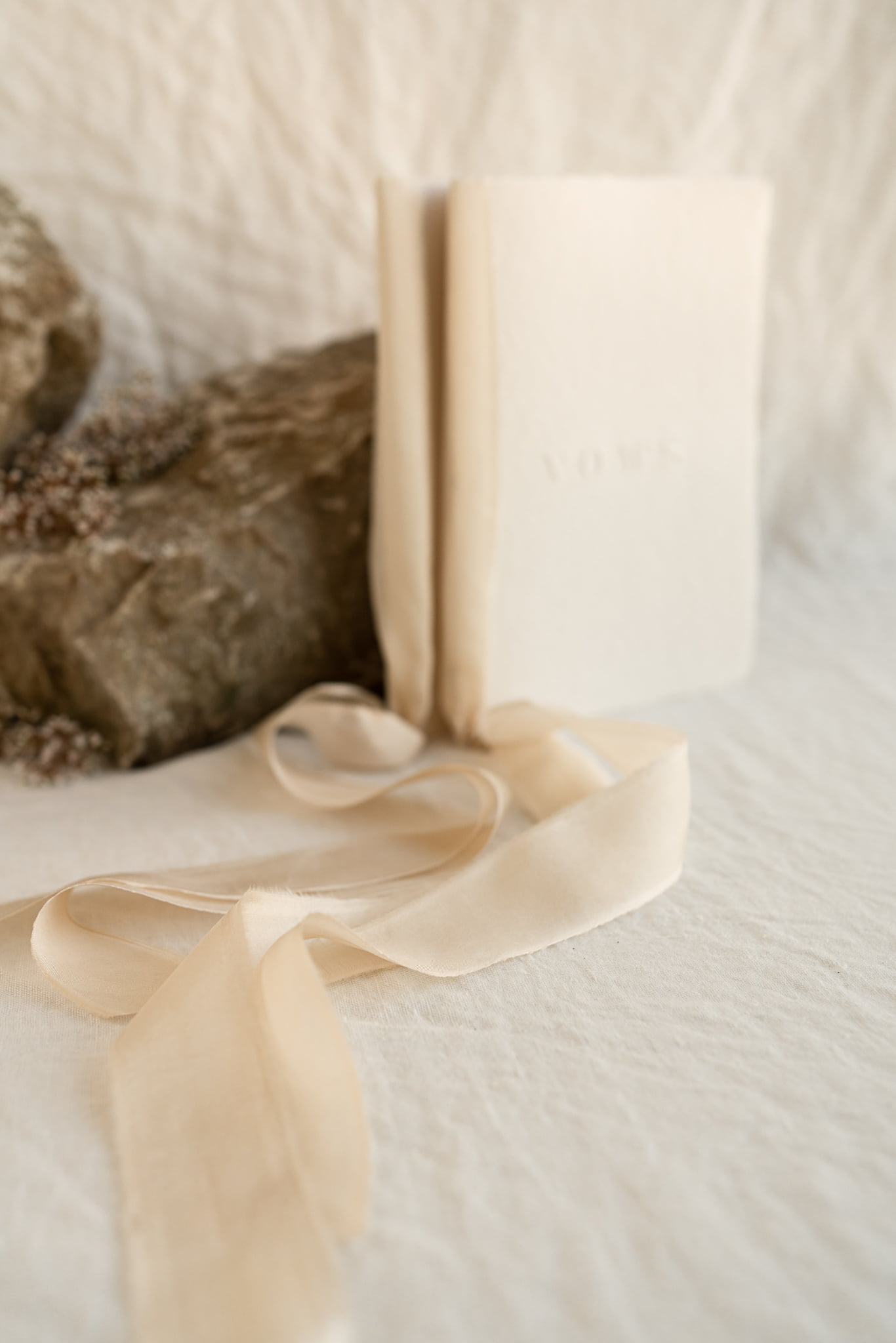 You can choose to have the vow books bound with our 3 cm (1.2”) naturally dyed silk ribbon, approximately 100 cm (40”) long.